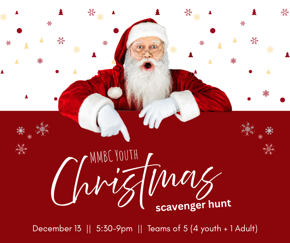 MMBC Youth and their friends are invited to join us for our 2025 Scavenger Hunt around Monroe! Students will be split into teams with their friends (Teams of 4 +1 Driver). Once teams are divided, the scavenger hunt begins!  Finding the items on their list and sending back pictures to prove their finds. The team that arrives back to the church on time with the most finds wins the Holiday Cheermister award!